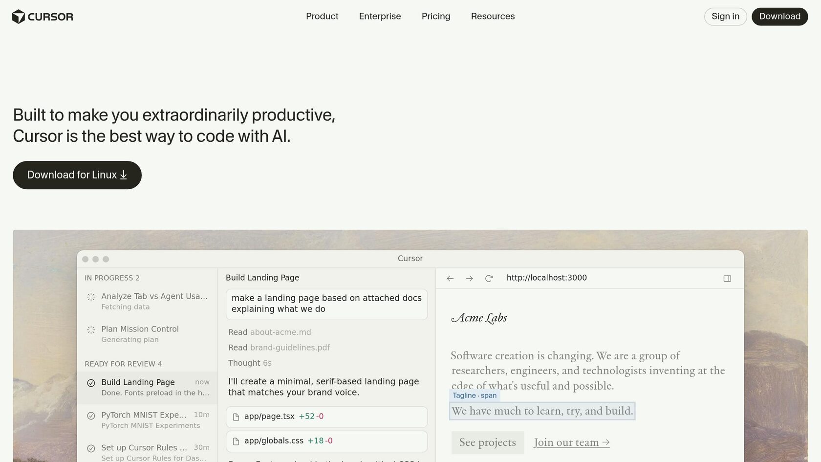 Since Cursor is based on VS Code, it supports the full range of VS Code extensions, making it easy for users to carry over their existing tools, themes, and keybindings [19]. However, it’s worth noting that Cursor is a standalone IDE, not a plugin, so it won’t integrate with editors like JetBrains or Neovim.